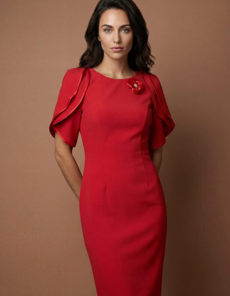 Prețul inițial a fost: 680,00 lei.575,00 leiPrețul curent este: 575,00 lei.ROCHIE DE ZI VSM1058A Roșie Midi Elegantă cu Mâneci Volante și Detaliu Floral