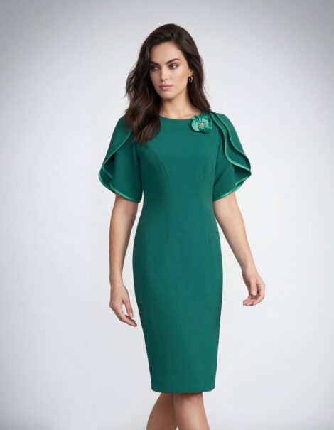 Prețul inițial a fost: 675,00 lei.525,00 leiPrețul curent este: 525,00 lei.ROCHIE DE ZI VSM1058B Midi Elegantă cu Mâneci Volante și Detaliu Floral – Verde Smarald