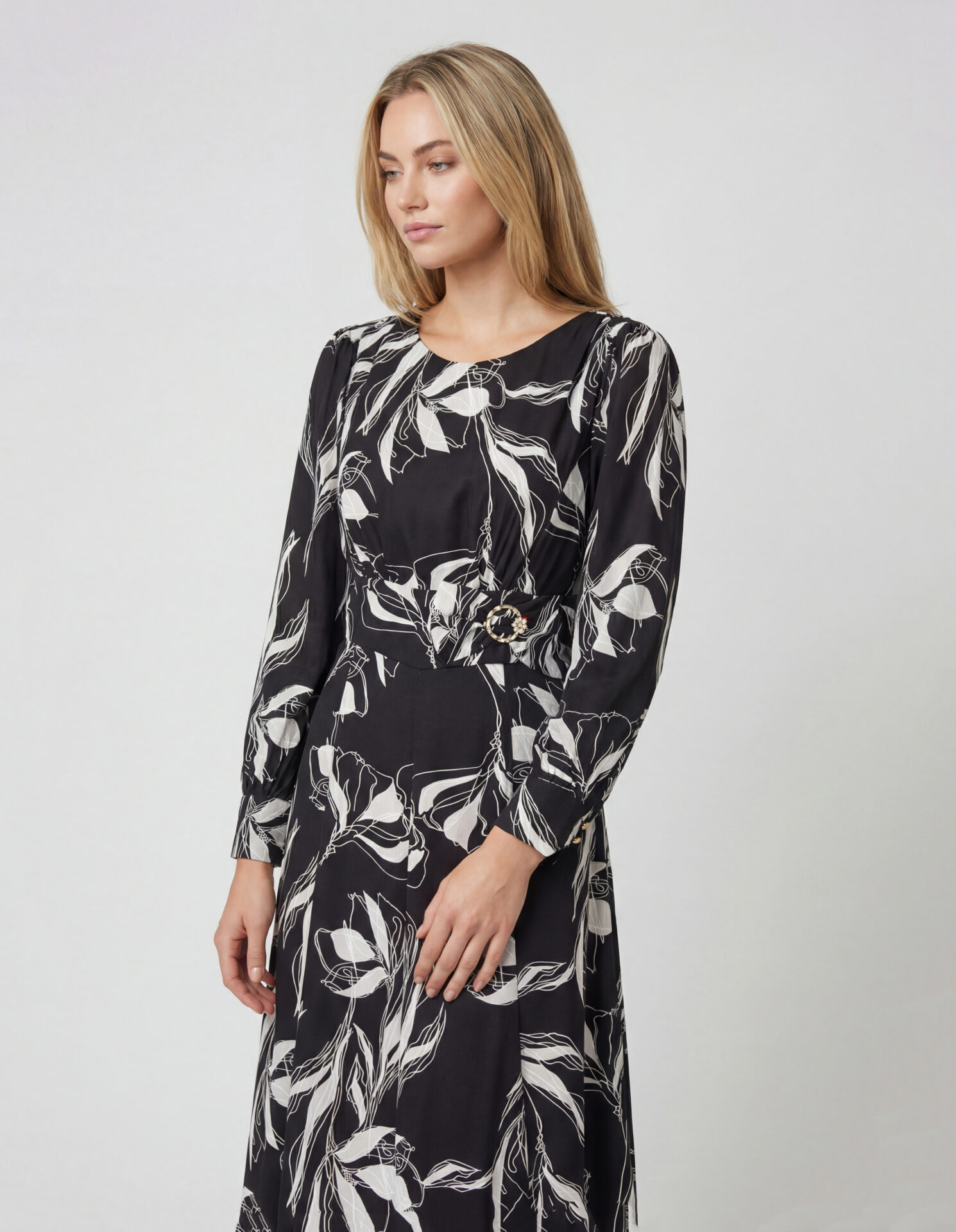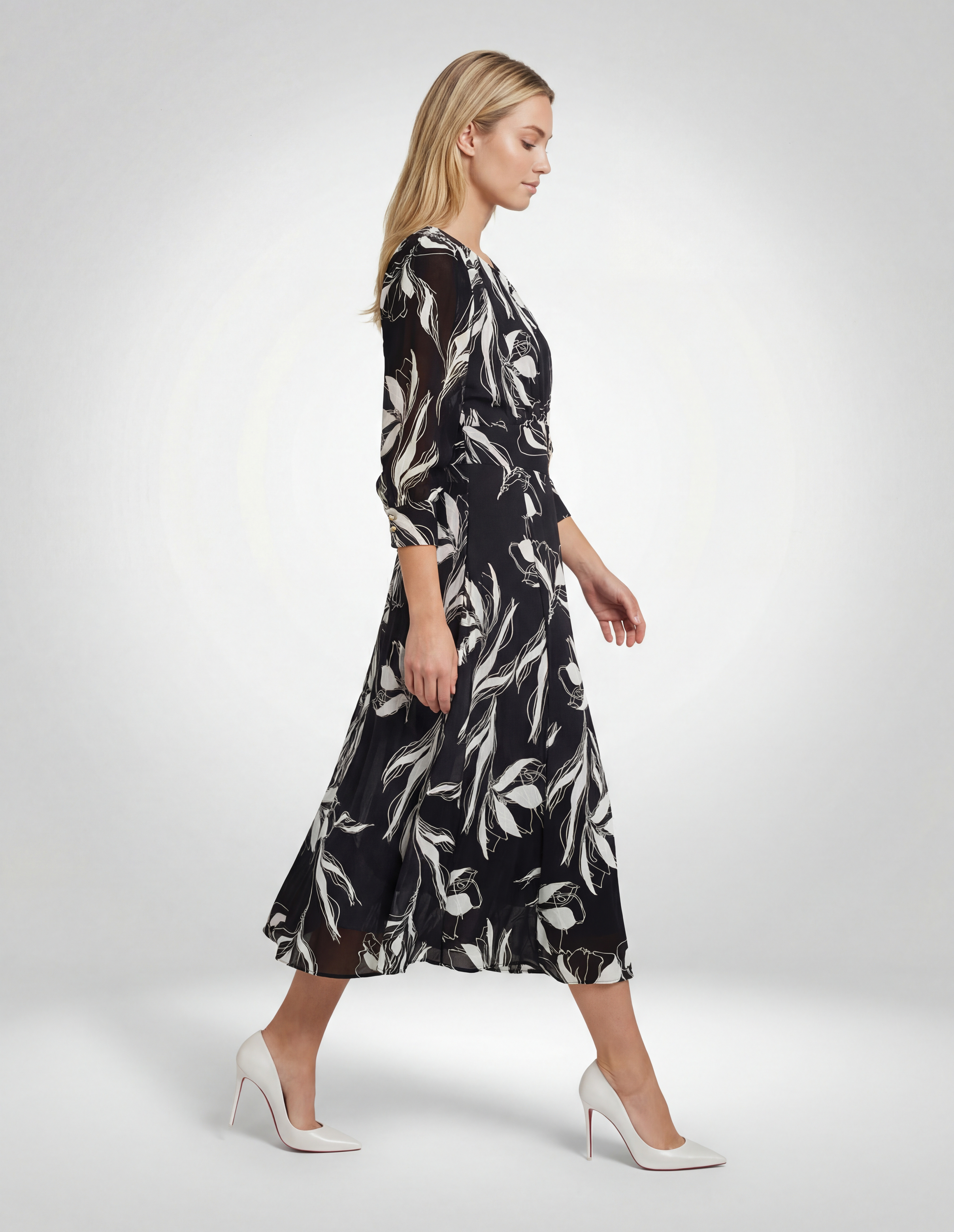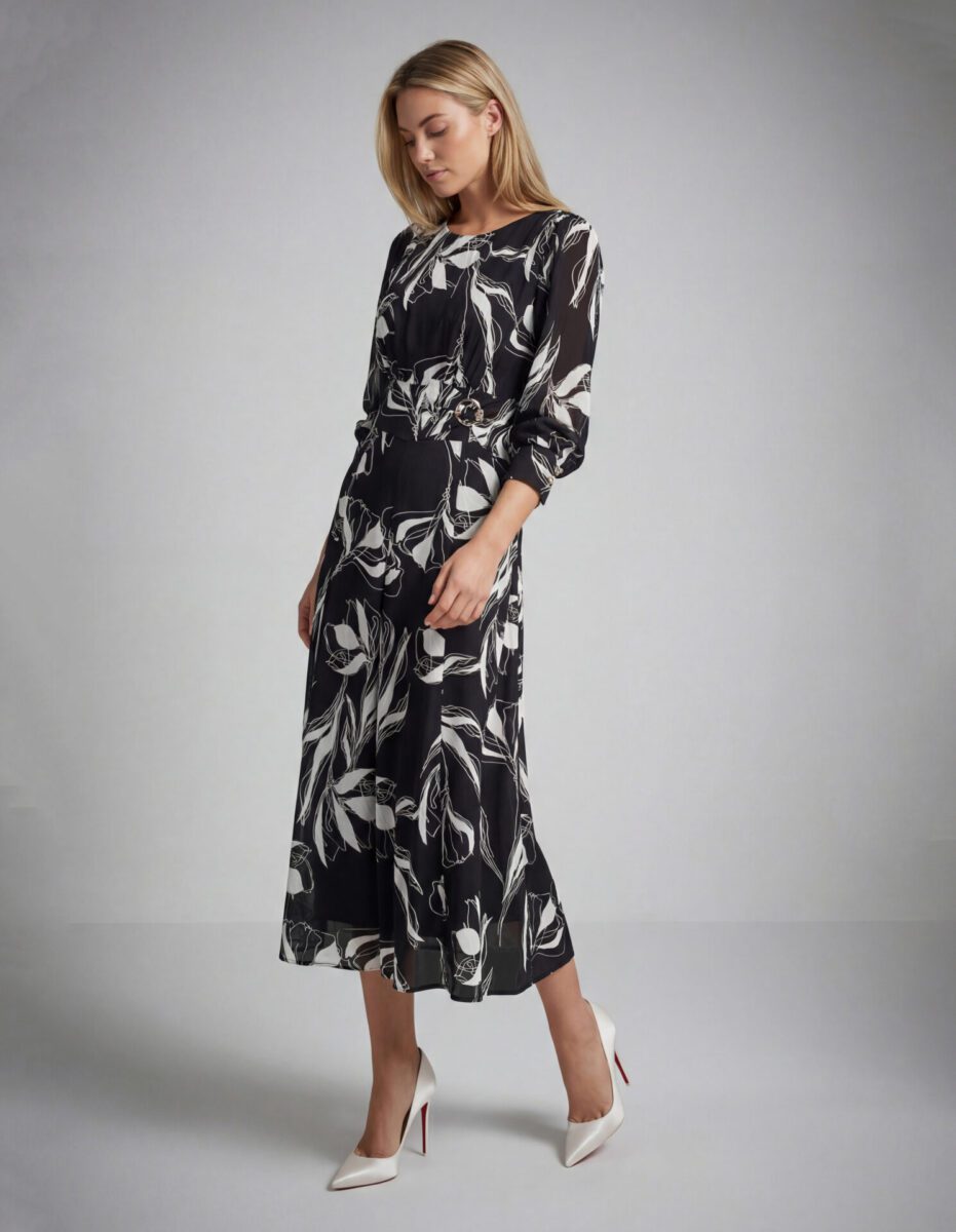 Rochie de ocazie sau de zi, de lungime midi cu mâneci clasice aplicate și manșetă, confecționată din triplu voal, căptușită, cu decolteu rotund, bandă în talie și creț sub bust.