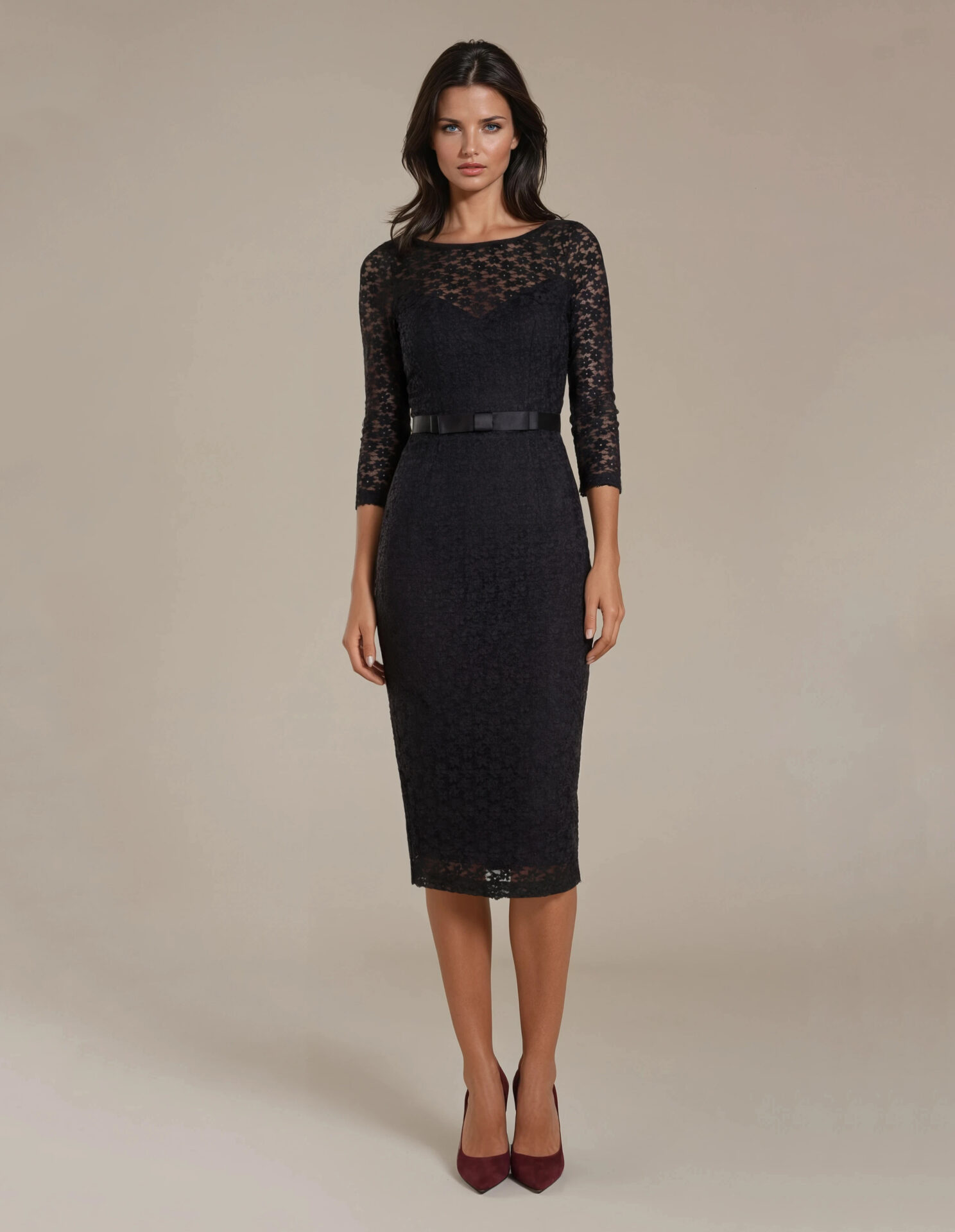 Rochie de zi sau de ocazie, de lungime midi cu mâneci raglan de lungime 3/4, cu croi ce urmărește linia corpului și cordon în talie.