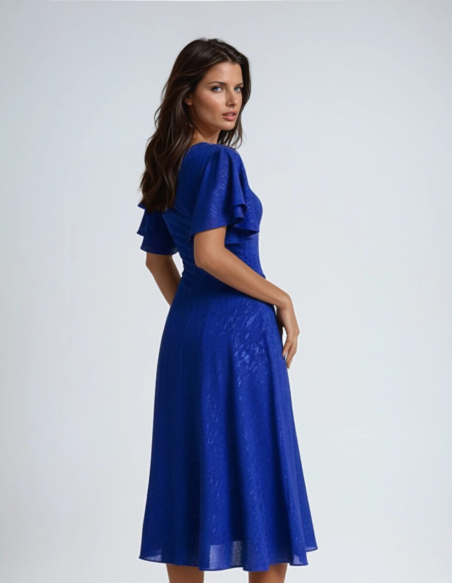 Rochie cocktail și de ocazie, de lungime midi cu mâneci tip volan dublu, confecționată din voal albastru uni cu pete de pensulă din sidef albastru, căptușită, cu decolteu rotund și cute pe umăr și în talie.