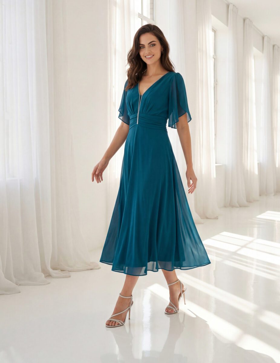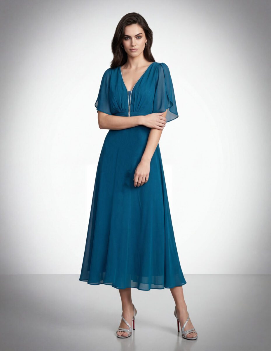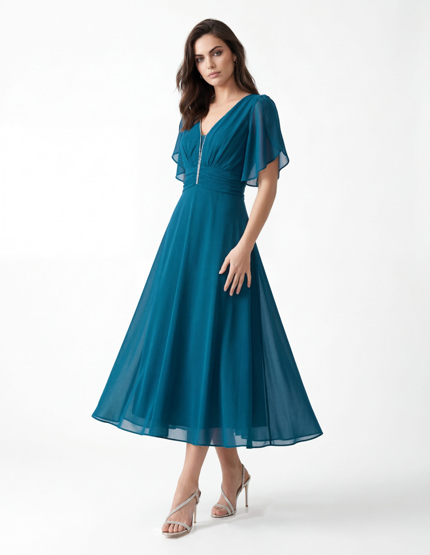 ROCHIE DE OCAZIE VSM1024 DIN VOAL TURCOAZ, încrețită în talie și sub bust, cu ornament din pietre înserat pe linia decolteului față.