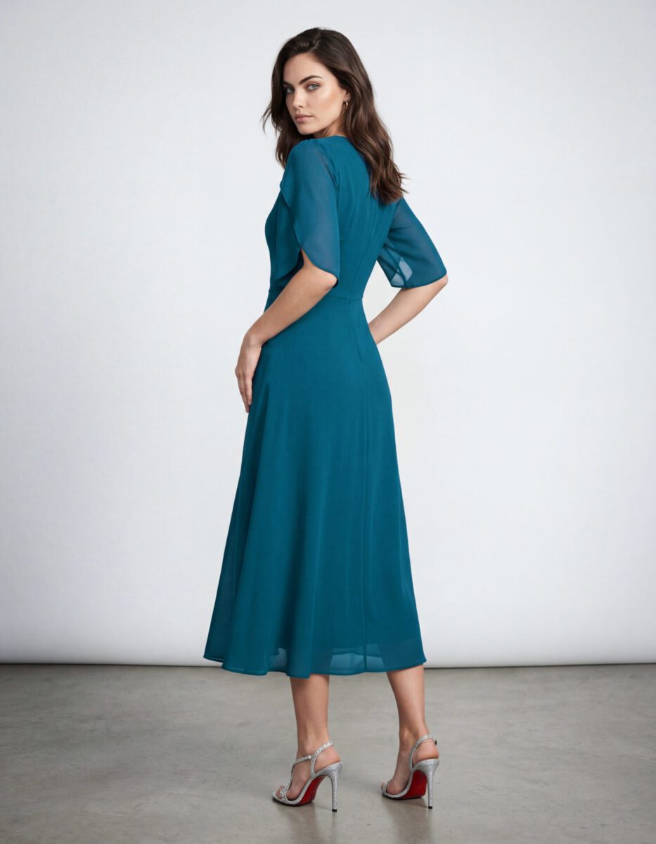 Rochie deocazie, de lungime midi cu mâneci duble tip volan suprapuse, confecționată din voal, căptușită, cu decolteu în V, creț în talie.
