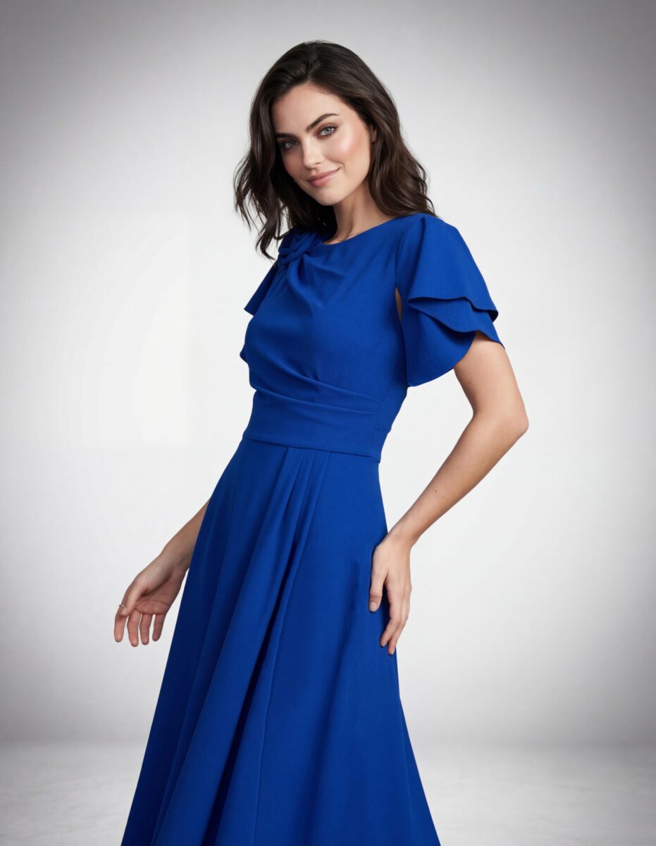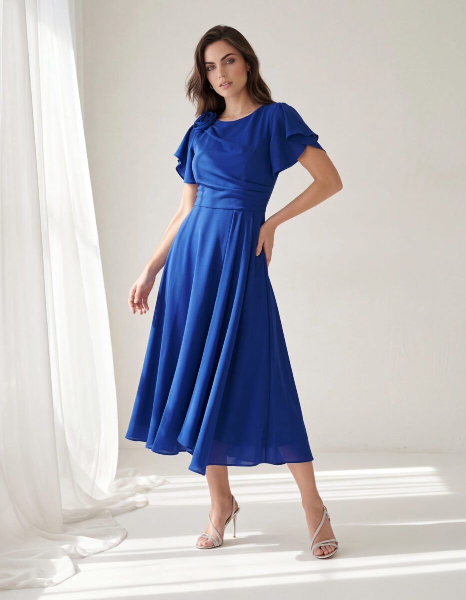 ROCHIE DE OCAZIE VSM1055B DIN TRIPLU VOAL ALBASTRU, cute asimetrice în talie, umăr și accesoriu.