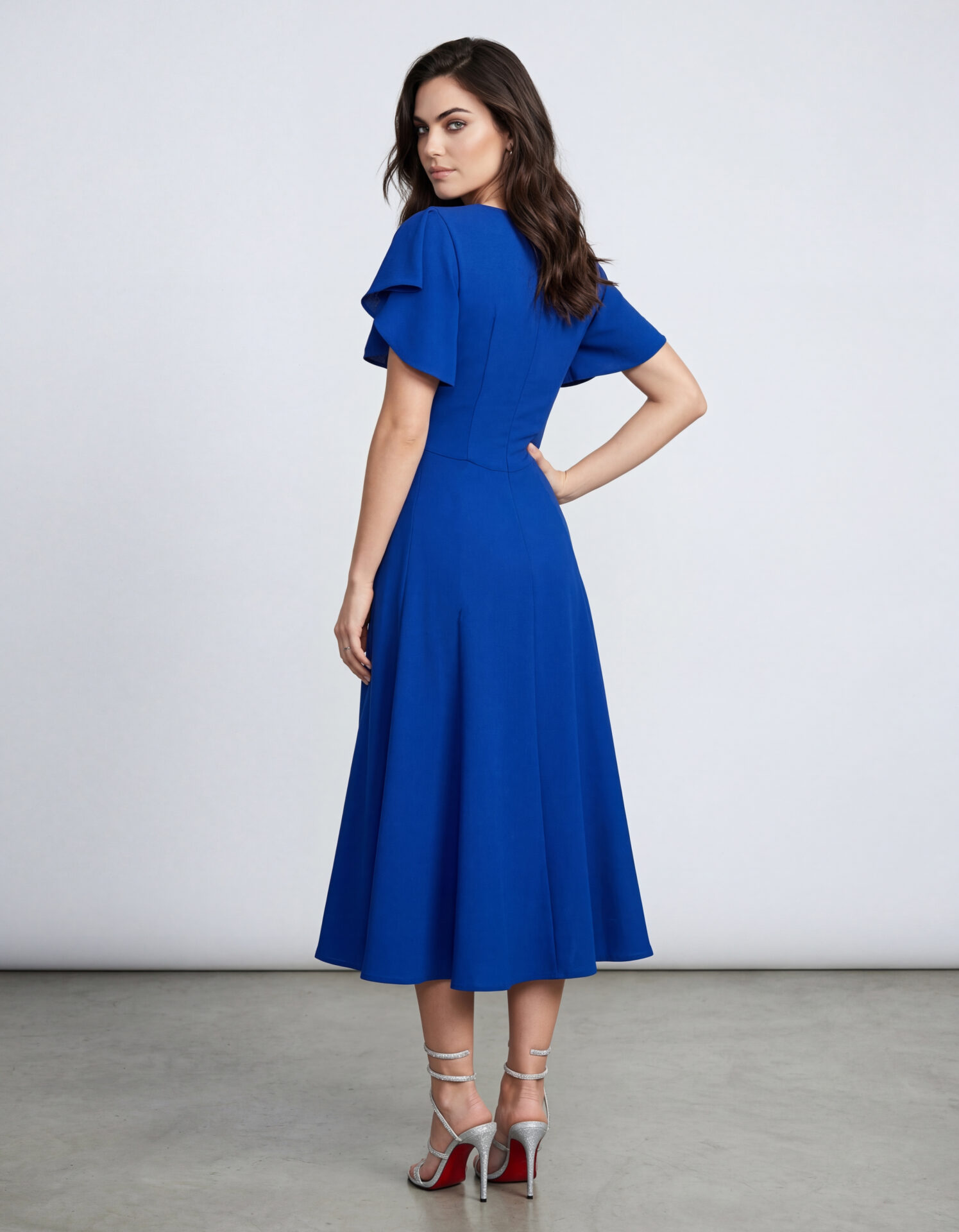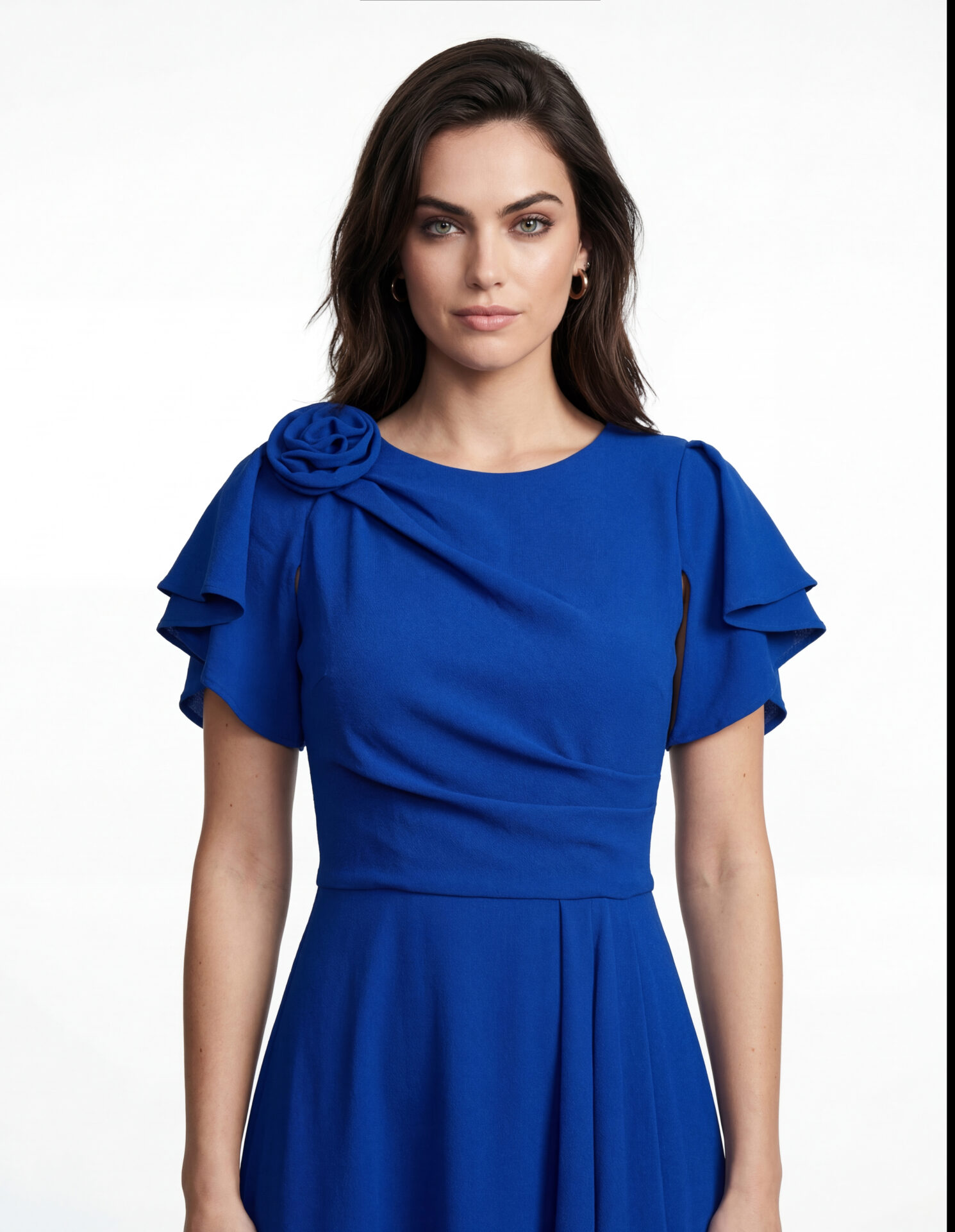 Rochie deocazie, de lungime midi cu mâneci duble tip volan, confecționată din triplu voal, căptușită, cu decolteu rotund suprapus, cute în talie și accesoriu pe umăr.