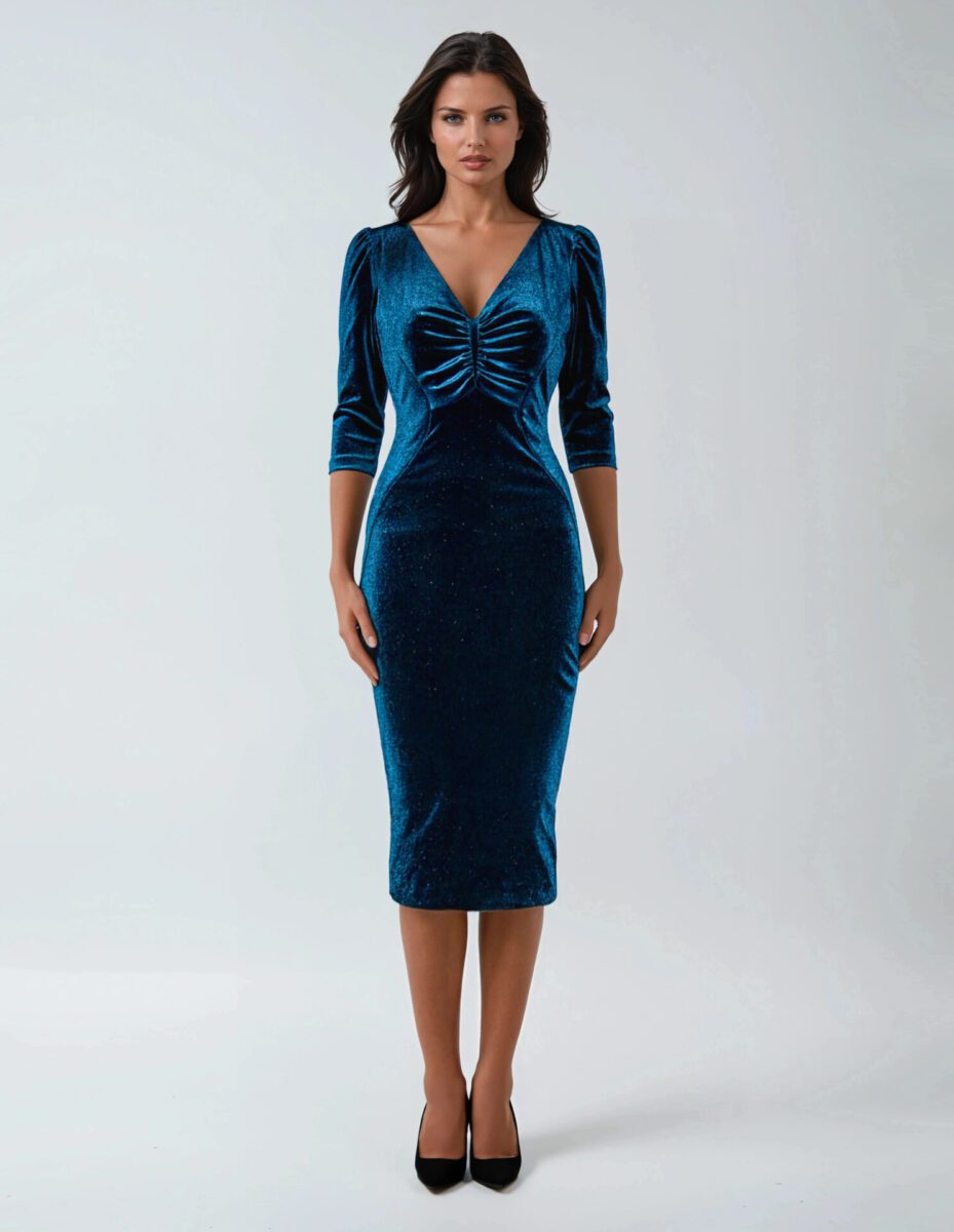 ROCHIE DE OCAZIE VSM956D din catifea turcoaz cu decolteu în V și creț pe bust.