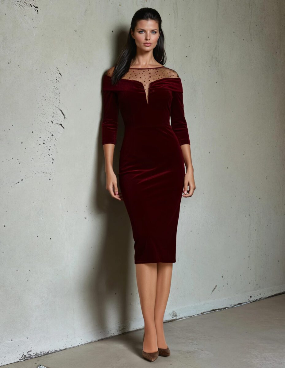 Rochie de ocazie, de lungime midi cu mâneci clasice aplicate de lungime 3/4, confecționată din catifea elastică, căptușită, cu decolteu transparent și guler.