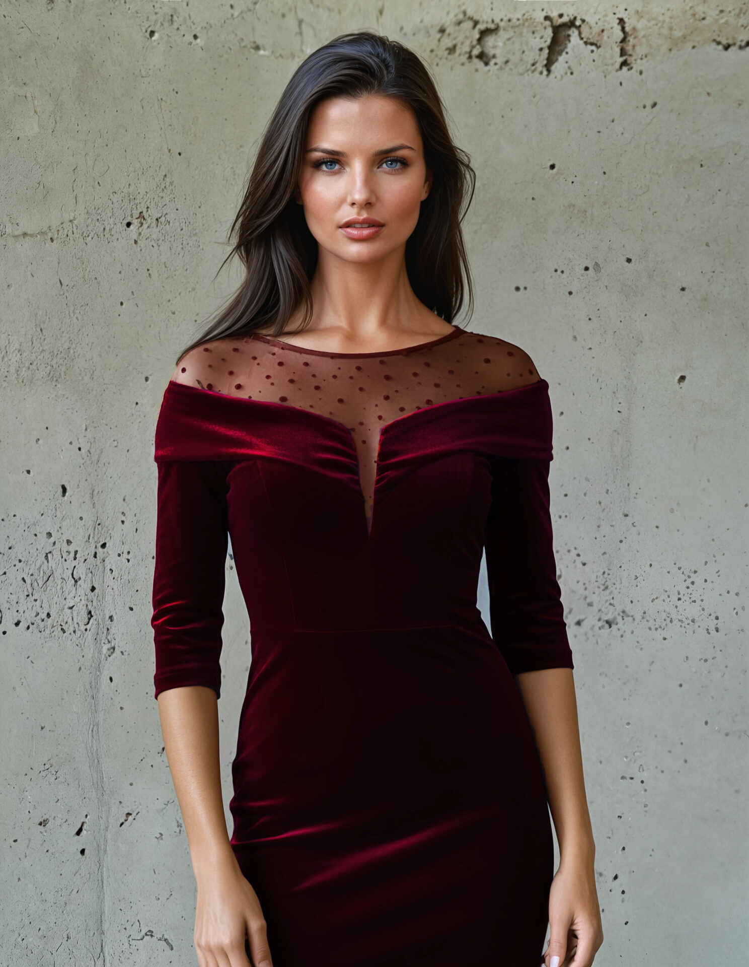 ROCHIE DE OCAZIE VSM963D din catifea burgund cu inserție de tul cu buline din catifea și guler pe decolteu.