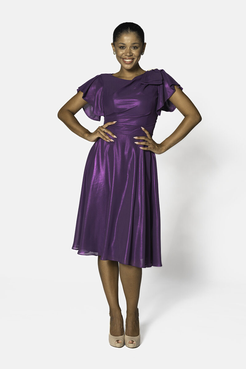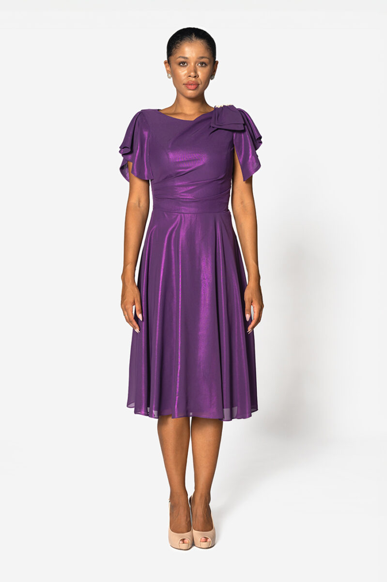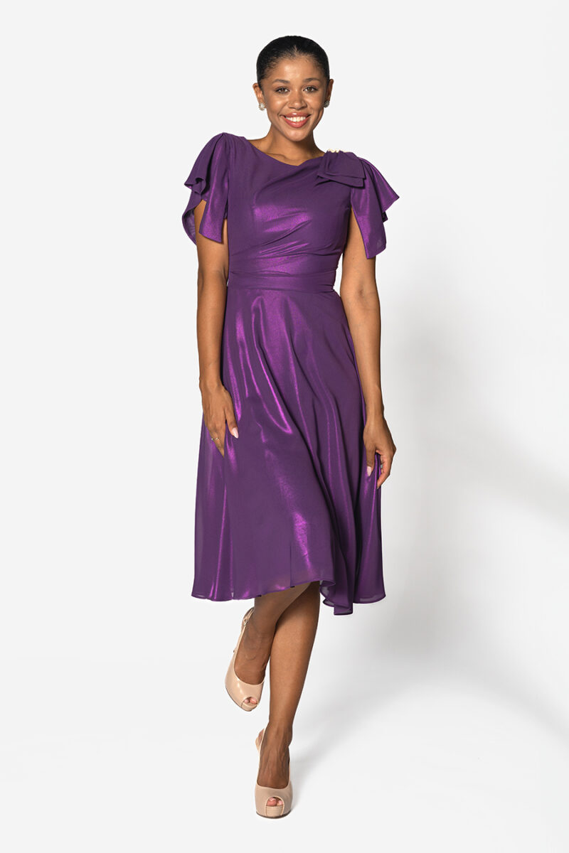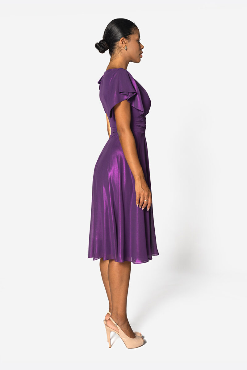 Stil: De ocazie. Croi: rochie tăiată în talie, cute asimtrice, mânecă tip volan, din voal sidefat mov, captușeală satinată.
