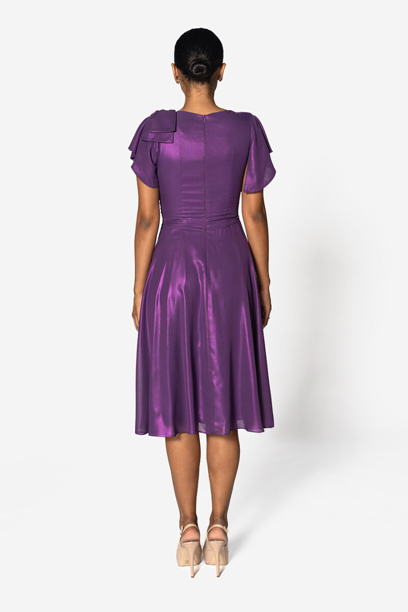 Rochie de ocazie sau tip cocktail. Model asimetric, de lungime medie, căptușit. Partea de bust are cute asimetrice în zona taliei și pe umăr, fusta cloș, fundă pe umăr.